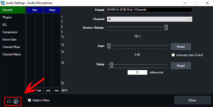 You can also choose to turn down the volume of your microphone in your headphones so you don't hear your own voice. To do that, click the cog icon button on the audio input to open its audio settings. Then turn down the headphones volume in the bottom left corner all the way down.